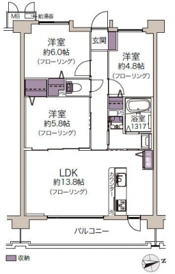 専有面積 60.92m2 間取り 3LDK (LD8.1/和室6/洋室5.1/洋室5/K2.9)